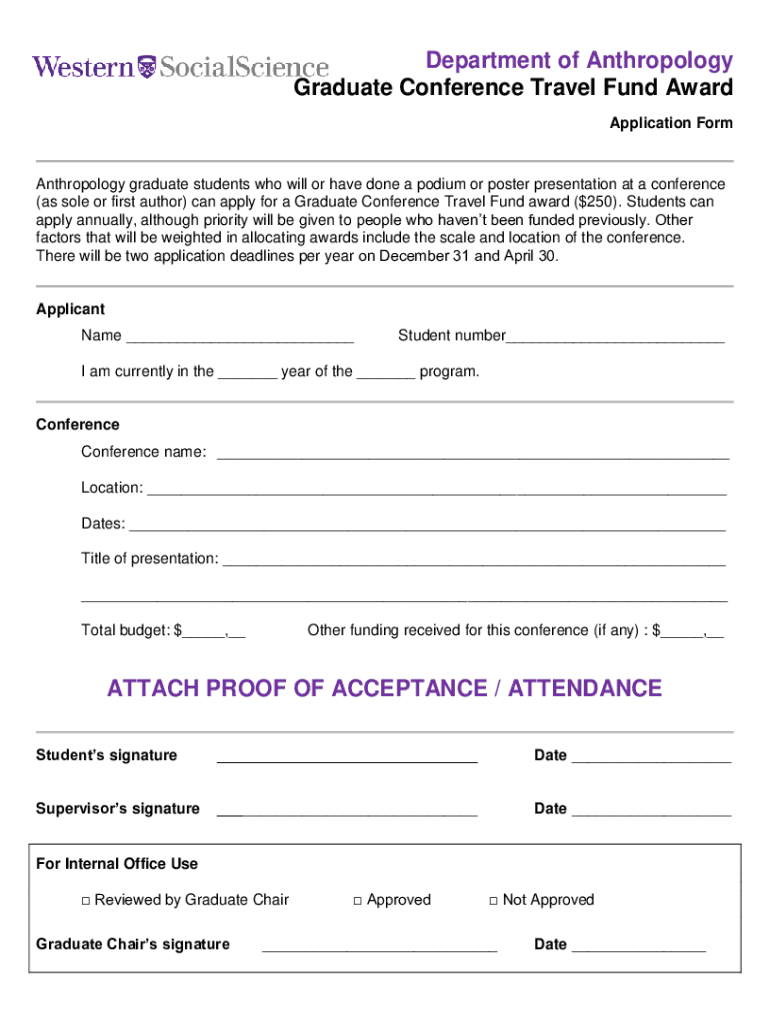 Department of Anthropology Graduate from Conference Travel Fund Award Application FormAnthropology graduate students who will or have done a podium or poster presentation at a conference (as sole