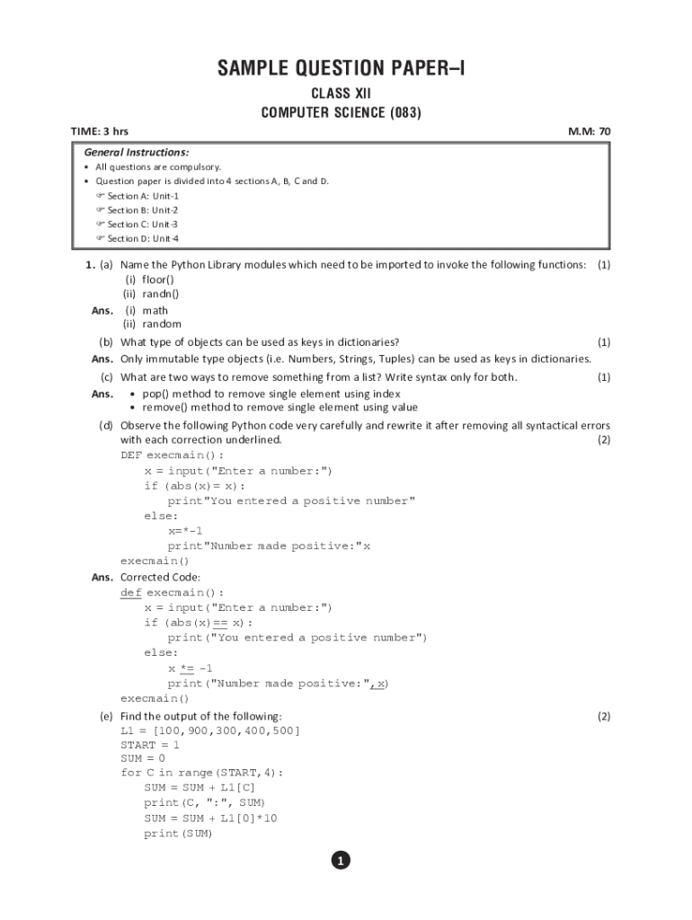 SAMPLE QUESTION PAPER CLASS XII COMPUTER SCIENCE (083) TIME: 3 RSM. M: 70General Instructions: All questions are compulsory. Question paper is divided into 4 sections A, B, C and D. Section A: Unit1