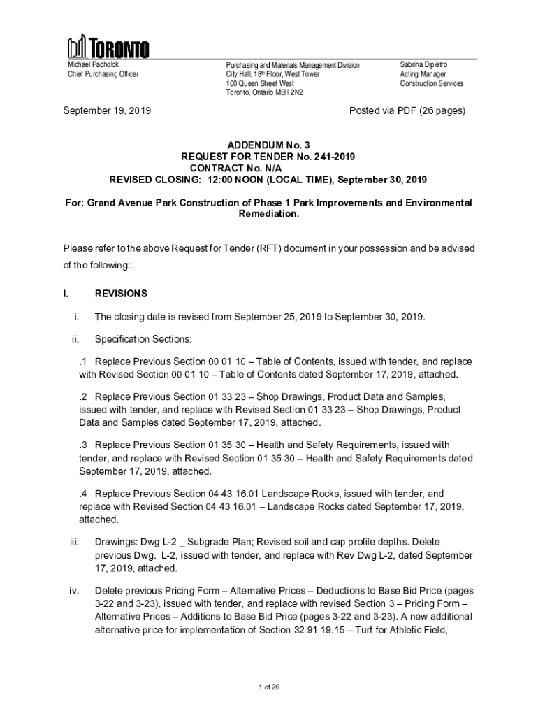 Michael Bachelor Chief Purchasing OfficerPurchasing and Materials Management Division City Hall, 18th Floor, West Tower 100 Queen Street West Toronto, Ontario M5H 2N2September 19, 2019Sabrina Pietro