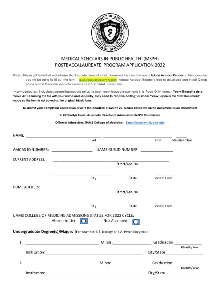 MEDICAL SCHOLARS IN PUBLIC HEALTH (MPH) POSTBACCALAUREATE PROGRAM APPLICATION 2022 This is a fillable PDF form that you will need to fill out electronically. First, download the latest version of