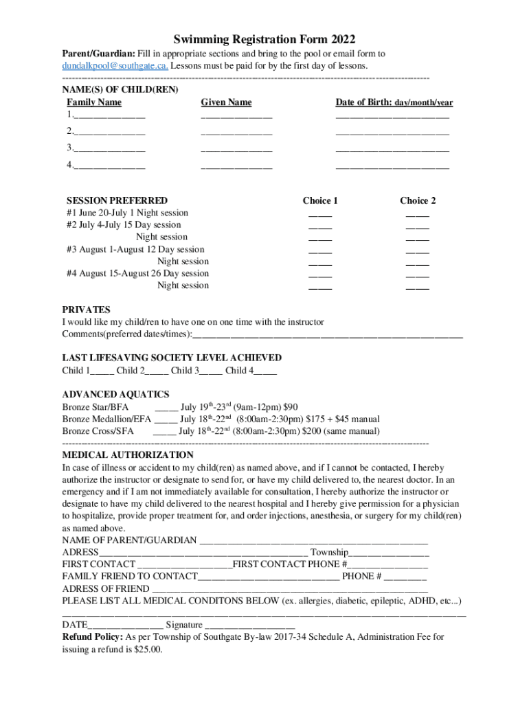 Swimming Registration Form 2022 Parent/Guardian: Fill in appropriate sections and bring to the pool or email form to dundalkpool@southgate.ca. Lessons must be paid for by the first day of lessons.