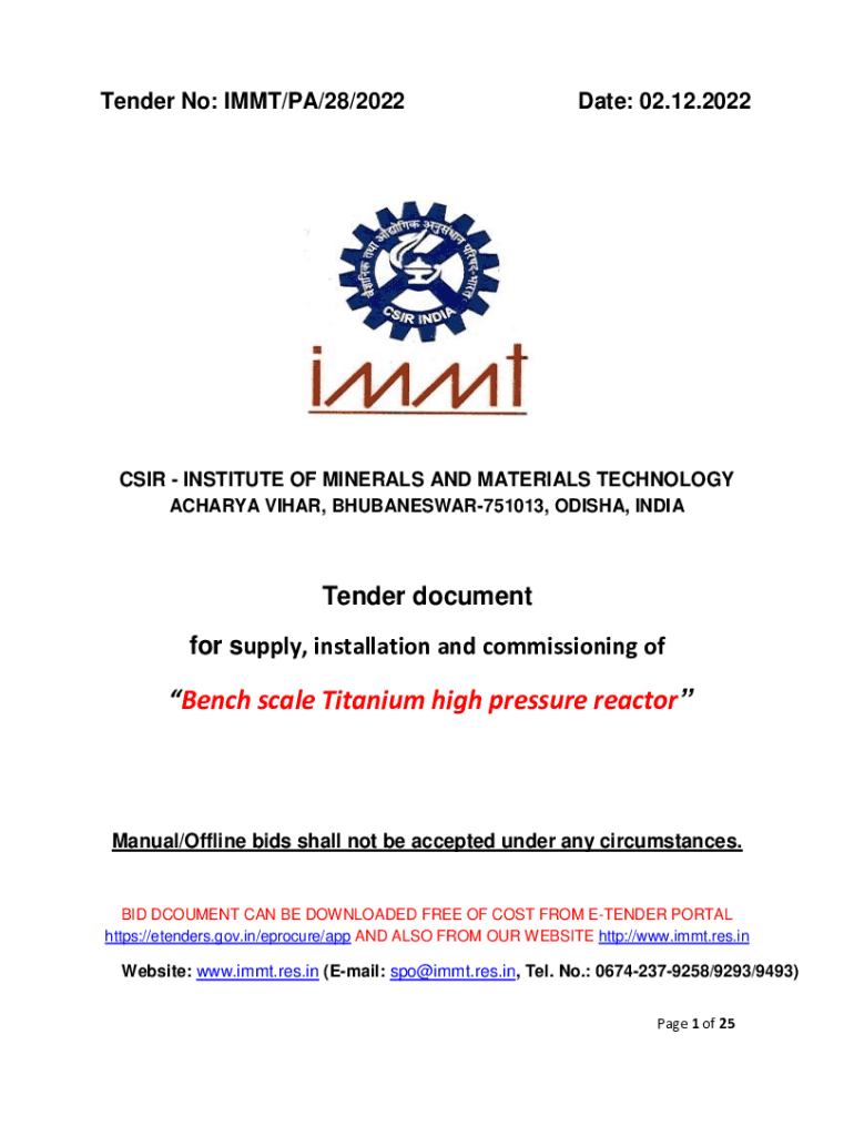 Tender No: IMT/PA/28/2022Date: 02.12.2022CSIR INSTITUTE OF MINERALS AND MATERIALS TECHNOLOGY ZACHARY VICAR, BHUBANESWAR751013, ODISHA, INDIATender document for supply, installation and commissioning