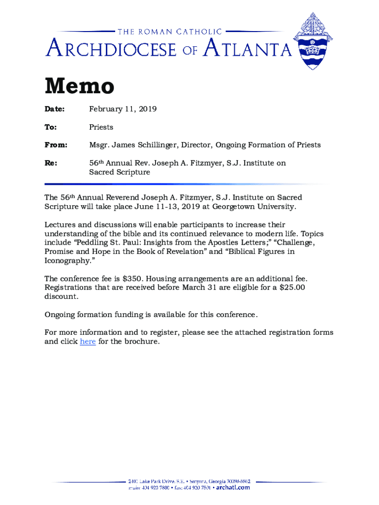 Date:February 11, 2019To:PriestsFrom:Msgr. James Schilling her, Director, Ongoing Formation of Priests Re:56th Annual Rev. Joseph A. Firmer, S.J. Institute on