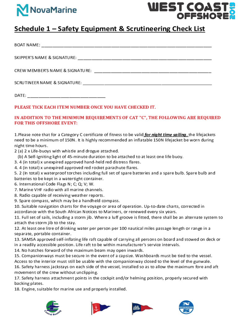 Schedule 1 Safety Equipment & Scrutinizing Check List BOAT NAME: ___ SKIPPERS NAME & SIGNATURE: ___ CREW MEMBERS NAME & SIGNATURE: ___ SCRUTINEER NAME & SIGNATURE: ___ DATE: ___ PLEASE TICK EACH ITEM