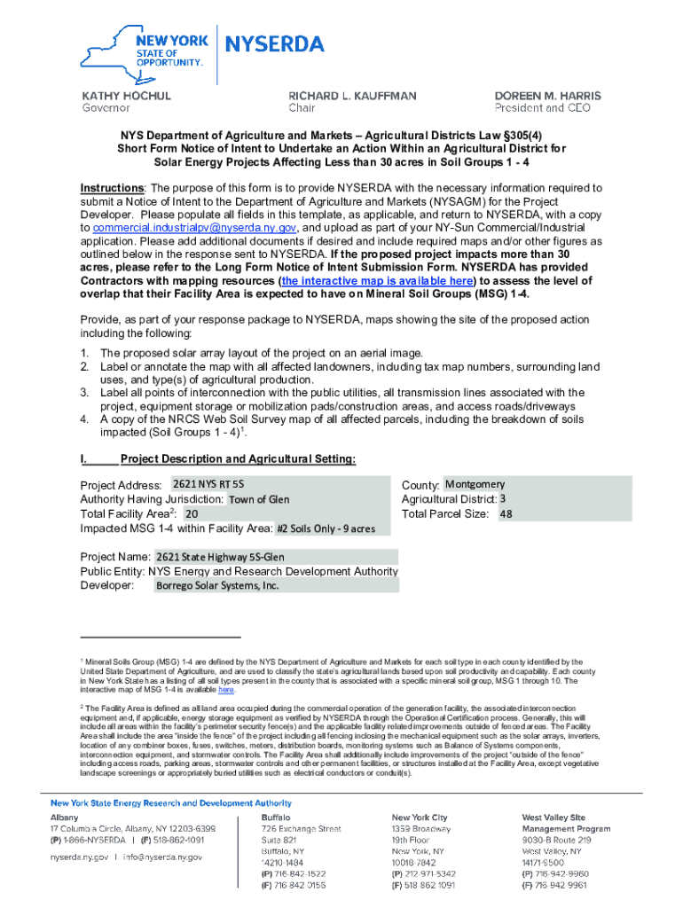 NYS Department of Agriculture and Markets Agricultural Districts Law 305(4) Short Form Notice of Intent to Undertake an Action Within an Agricultural District for Solar Energy Projects Affecting Less