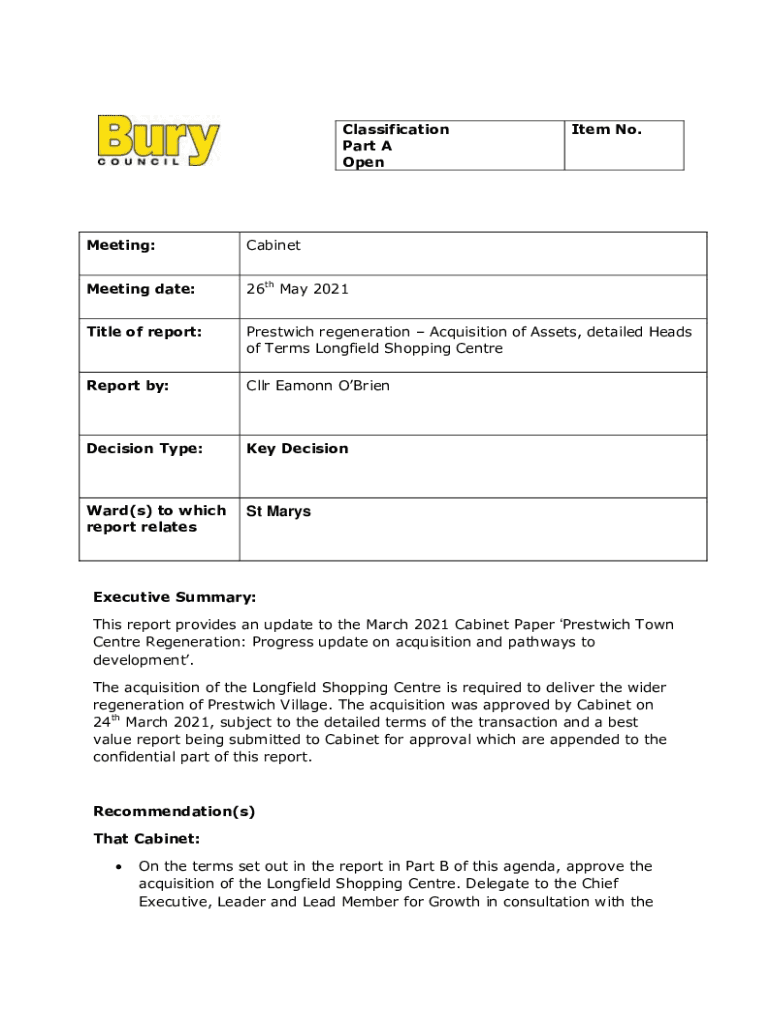 Opened No. Meeting:Cabinetmaking date:26th May 2021Title of report:Prestige regeneration Acquisition of Assets, detailed Heads