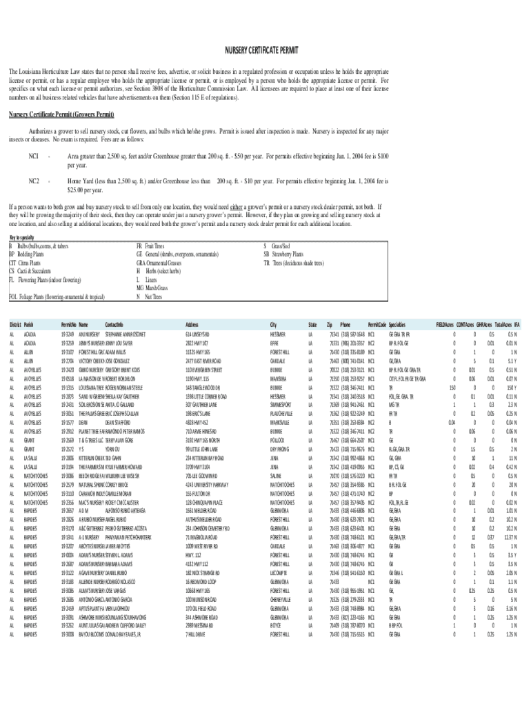 NURSERY CERTIFICATE PERMIT The Louisiana Horticulture Law states that no person shall receive fees, advertise, or solicit business in a regulated profession or occupation unless he holds the appropriate