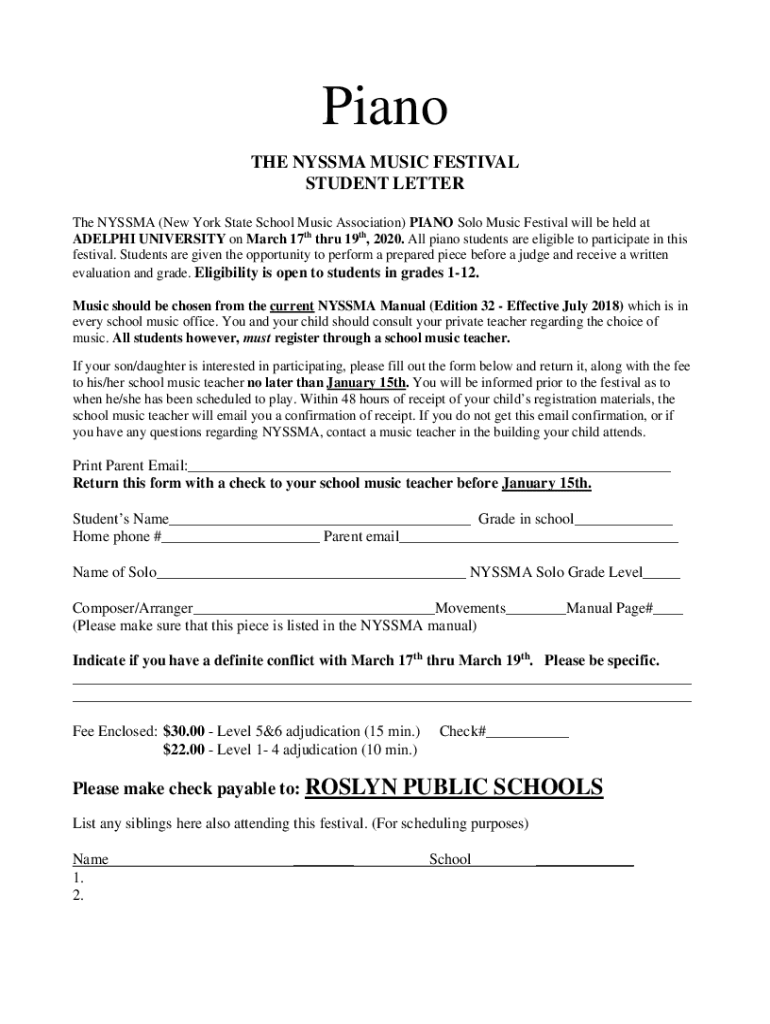 Piano THE NYASA MUSIC FESTIVAL STUDENT LETTER The NYASA (New York State School Music Association) PIANO Solo Music Festival will be held at DELPHI UNIVERSITY on March 17th through 19th, 2020. All