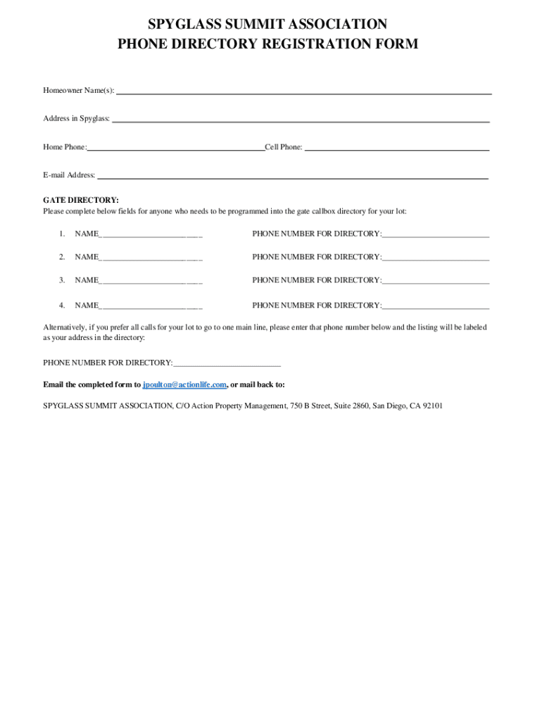 SPYGLASS SUMMIT ASSOCIATION PHONE DIRECTORY REGISTRATION FORM Homeowner Name(s):Address in Spyglass:Home Phone:Cell Phone:Email Address: GATE DIRECTORY: Please complete below fields for anyone who