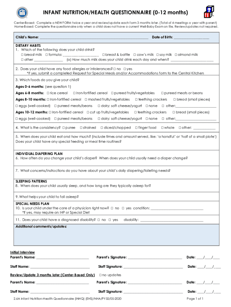 INFANT NUTRITION/HEALTH QUESTIONNAIRE (012 months) Centered: Complete a NEW FORM twice a year and review/update each form 3 months later. (Total of 4 meetings a year with parent) Homeland: Complete