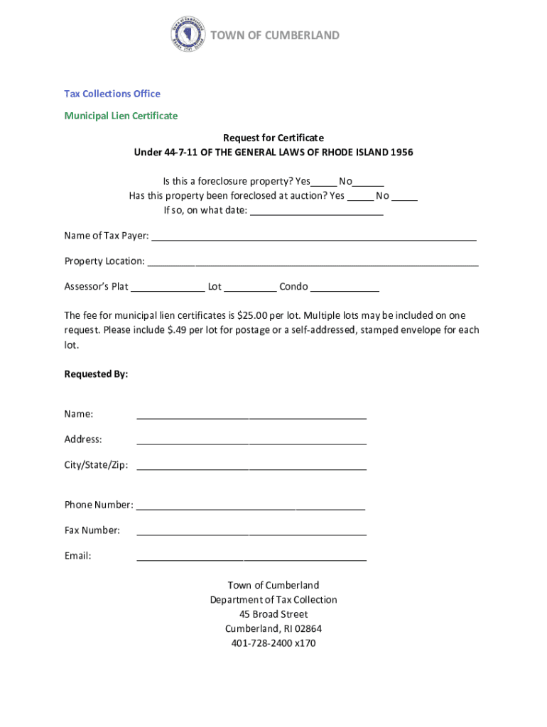 Get the free Tax Lien Certificate Request - Cumberland Fire District