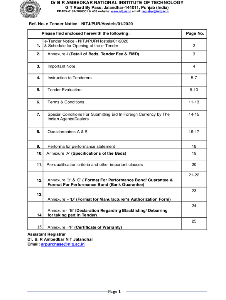 Dr B R AMBER NATIONAL INSTITUTE OF TECHNOLOGY G T Road By Pass, Jalandhar144011, Punjab (India) EPABX01812690301 & 453 websites: www.nitj.ac.in email: registrar@nitj.ac.inRef. No. tender Notice NITA/PUR/Hostels/01/2020
