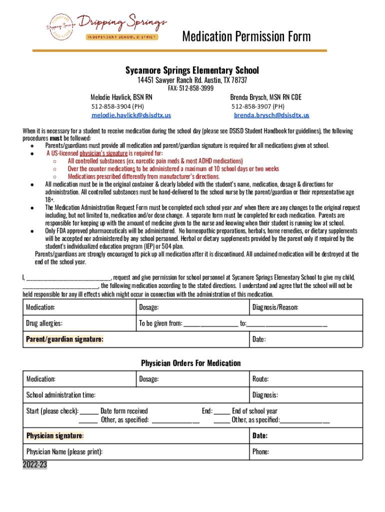 Medication Permission Form Sycamore Springs Elementary School 14451 Sawyer Ranch Rd. Austin, TX 78737 FAX: 5128583999Melodie Heimlich, BSN RN 5128583904 (PH) melodie.havlick@dsisdtx.usBrenda Branch,