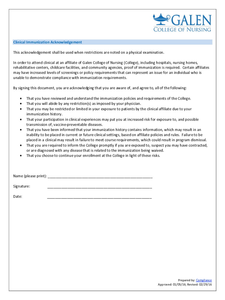 Clinical Immunization Acknowledgement This acknowledgement shall be used when restrictions are noted on a physical examination. In order to attend clinical at an affiliate of Galen College of Nursing