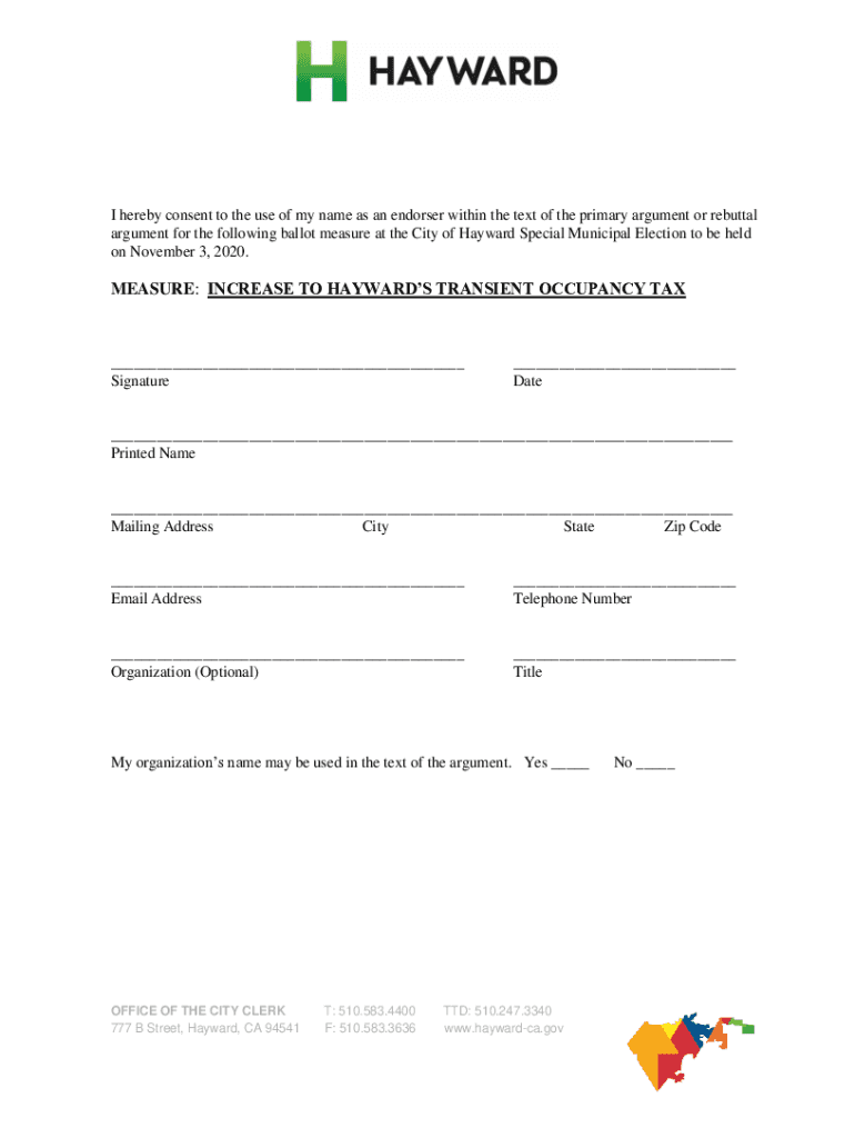 I hereby consent to the use of my name as an endorser within the text of the primary argument or rebuttal argument for the following ballot measure at the City of Hayward Special Municipal Election