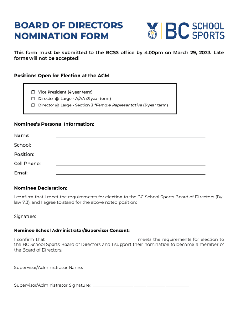 BOARD OF DIRECTORS NOMINATION FORM This form must be submitted to the BASS office by 4:00pm on March 29, 2023. Late forms will not be accepted! Positions Open for Election at the AGM Vice President