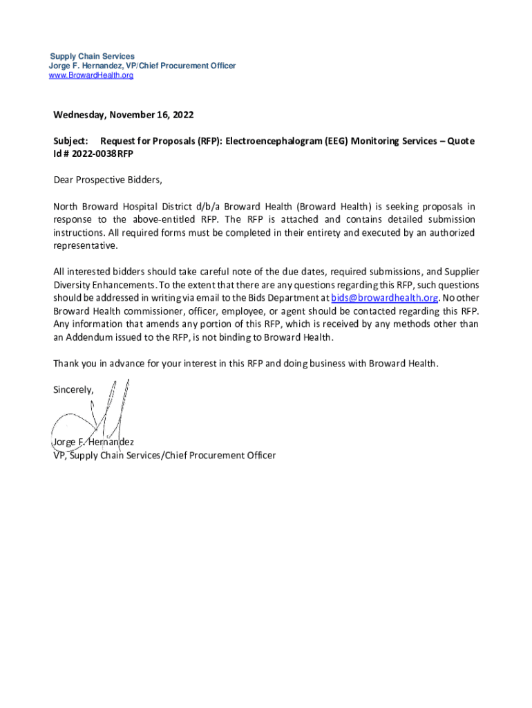 Supply Chain Services Jorge F. Hernandez, VP/Chief Procurement Officer www.BrowardHealth.orgWednesday, November 16, 2022, Subject: Request for Proposals (RFP): Electroencephalogram (EEG) Monitoring