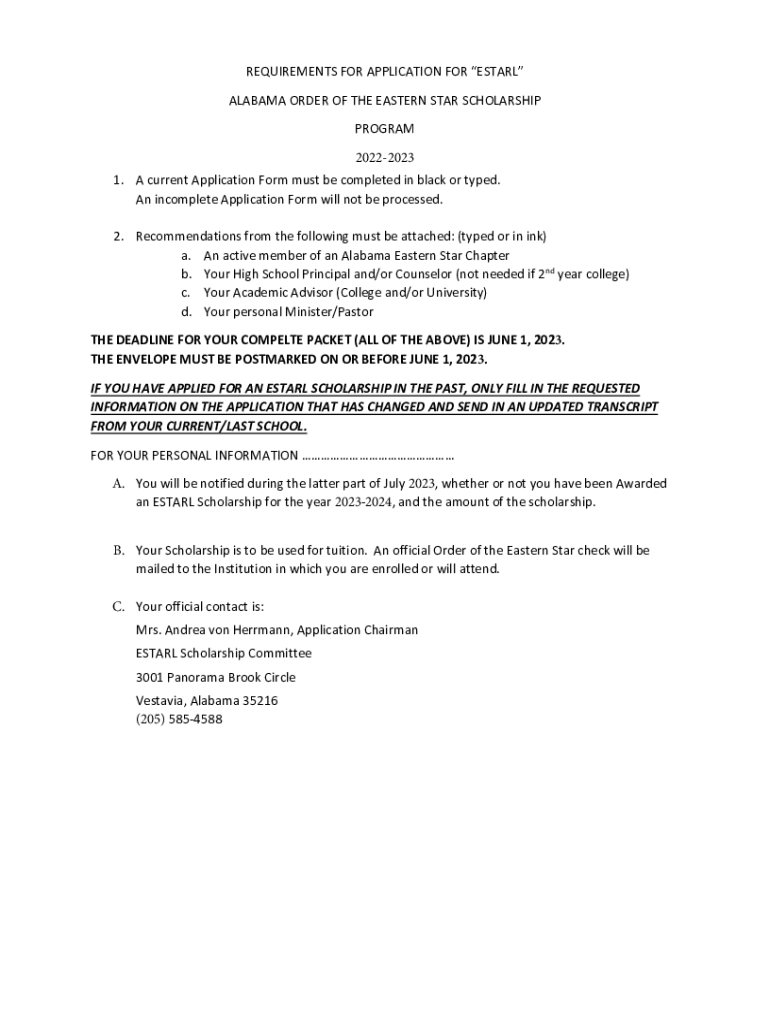 REQUIREMENTS FOR APPLICATION FOR EST ARL ALABAMA ORDER OF THE EASTERN STAR SCHOLARSHIP PROGRAM 20222023 1. A current Application Form must be completed in black or typed. An incomplete Application