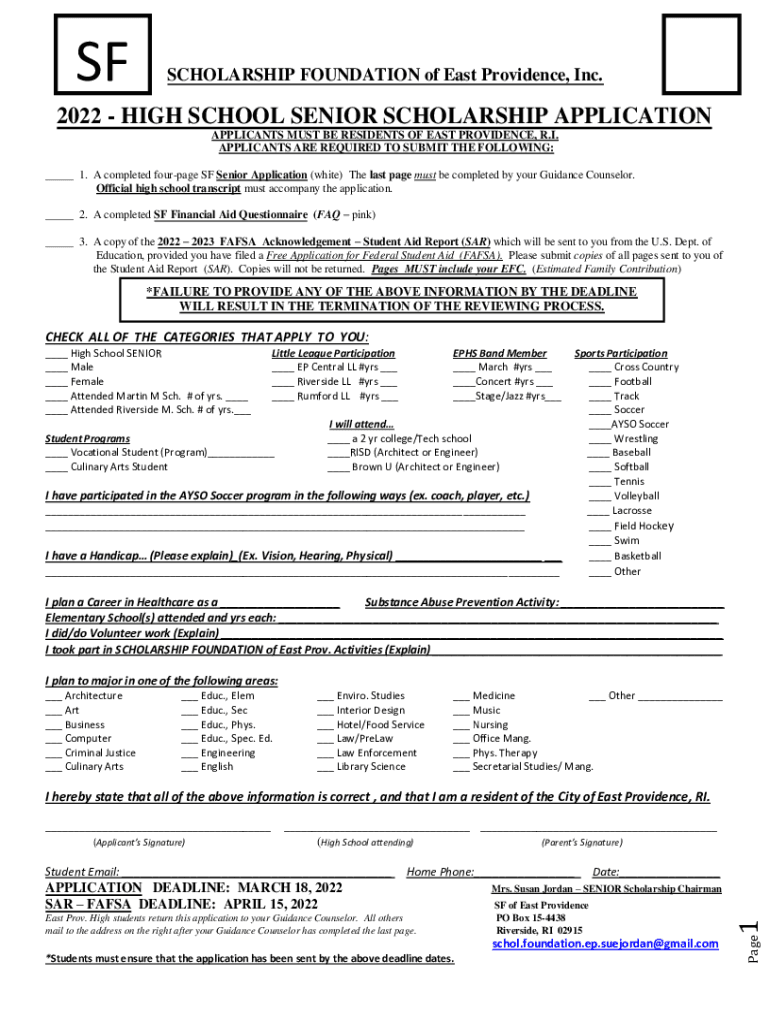 SCHOLARSHIP FOUNDATION of East Providence, Inc.2022 HIGH SCHOOL SENIOR SCHOLARSHIP APPLICATION APPLICANTS MUST BE RESIDENTS OF EAST PROVIDENCE, R.I. APPLICANTS ARE REQUIRED TO SUBMIT THE FOLLOWING: