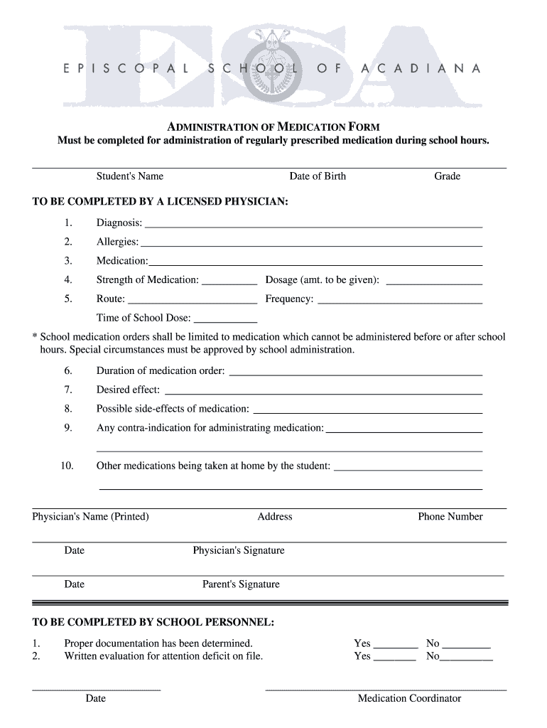 ADMINISTRATION OF MEDICATION FORM Must be completed for administration of regularly prescribed medication during school hours. Student's Name Date of Birth Grade TO BE COMPLETED BY A LICENSED PHYSICIAN: