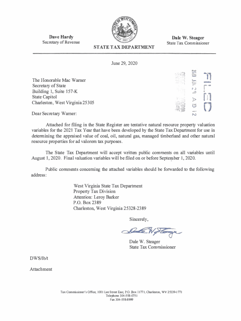 Dave Hardy Secretary of Revenue\'\'$, /1.1.STATE TAX DEPARTMENT Dale W. SteagerState Tax Commissioner June 29, 2020r1]The Honorable Mac Warner