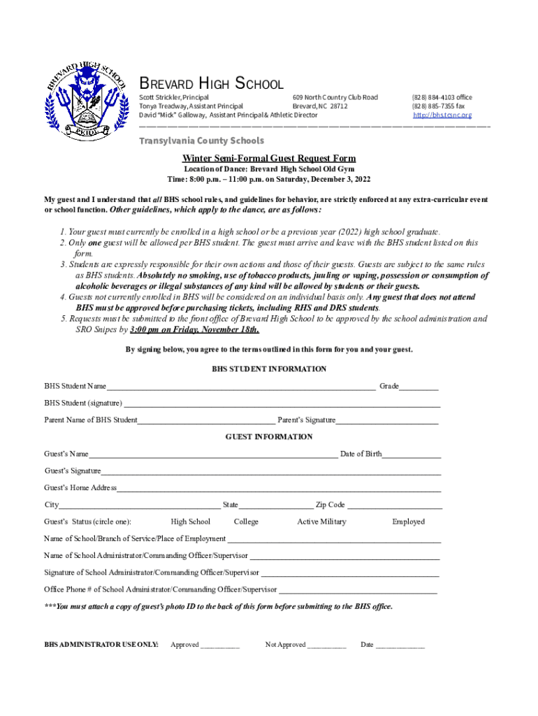 BREVARD HIGH SCHOOL Scott Stickler, Principal 609 North Country Club Road (828) 8844103 office Tonya Tread way, Assistant Principal Brevard, NC 28712 (828) 8857355 fax David Mick Galloway, Assistant