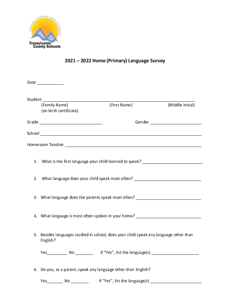 2021 2022 Home (Primary) Language Sultanate ___Student ___ (Family Name) (First Name) (Middle Initial) (on birth certificate) Grade ___Gender ___School ___ Homeroom Teacher ___1. What is the first