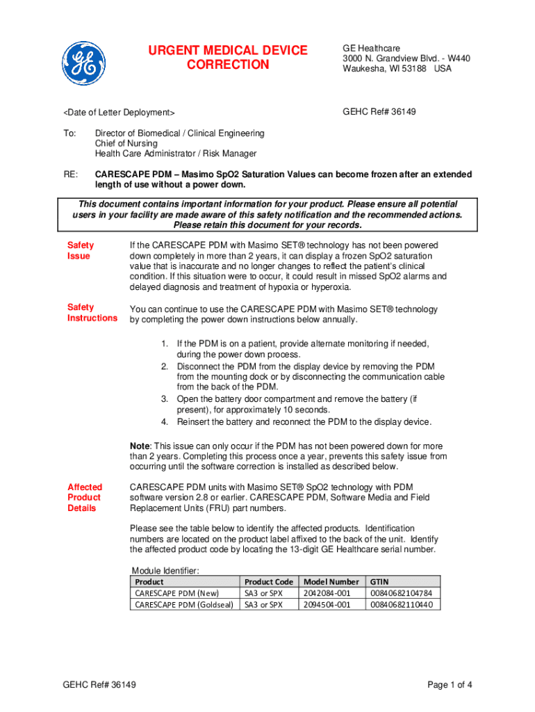 URGENT MEDICAL DEVICE Correctional of Letter Deployment GE Healthcare 3000 N. Grandview Blvd. W440 Waukesha, WI 53188 USAGE Ref# 36149To:Director of Biomedical / Clinical Engineering Chief of Nursing