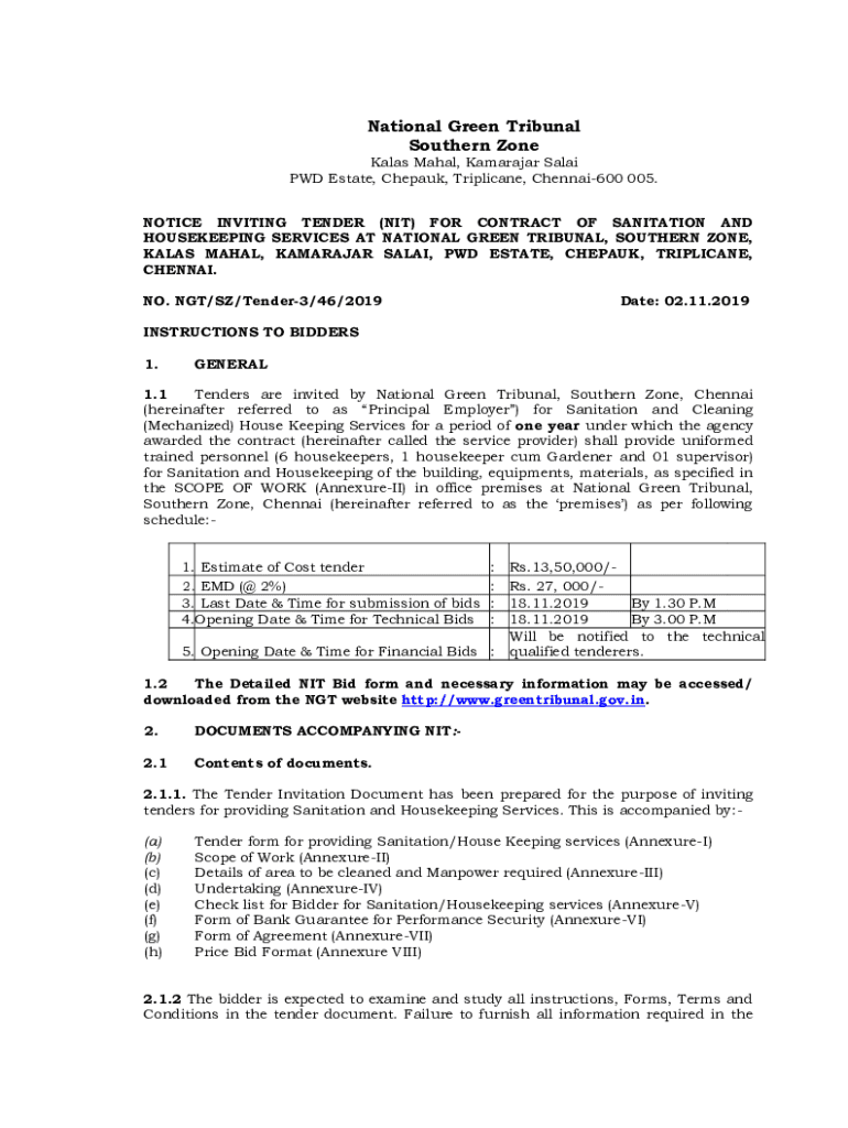 National Green Tribunal Southern Zone Alas Mahan, Maharajah Salad PhD Estate, Check, Triplicate, Chennai600 005. NOTICE INVITING TENDER (NIT) FOR CONTRACT OF SANITATION AND HOUSEKEEPING SERVICES AT