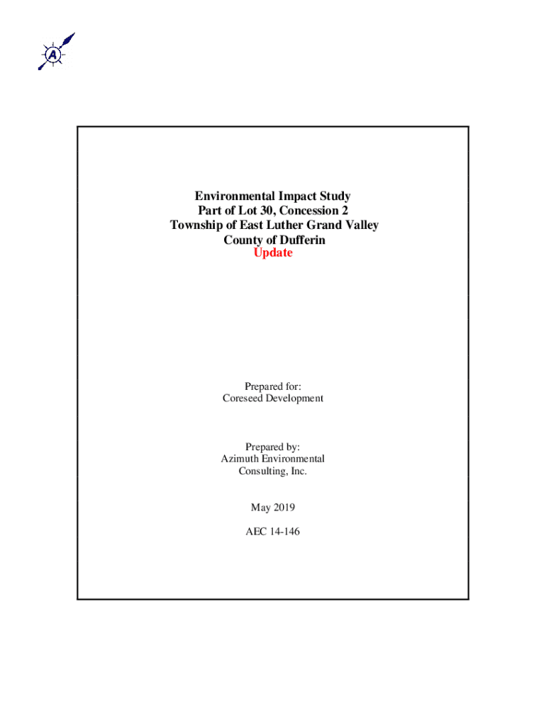 Environmental Impact Study Part of Lot 30, Concession 2 Township of East Luther Grand Valley County of Duffer in UpdatePrepared for: Core seed DevelopmentPrepared by: Azimuth Environmental Consulting,