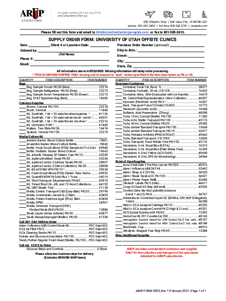 500 Chip eta Way | Salt Lake City, UT 841081221 phone: 8015812430 | toll-free: 8002422787 | Arab. Complete fill out this form and email to UHInformationCenter@aruplab.com or fax to 8015852413.SUPPLY