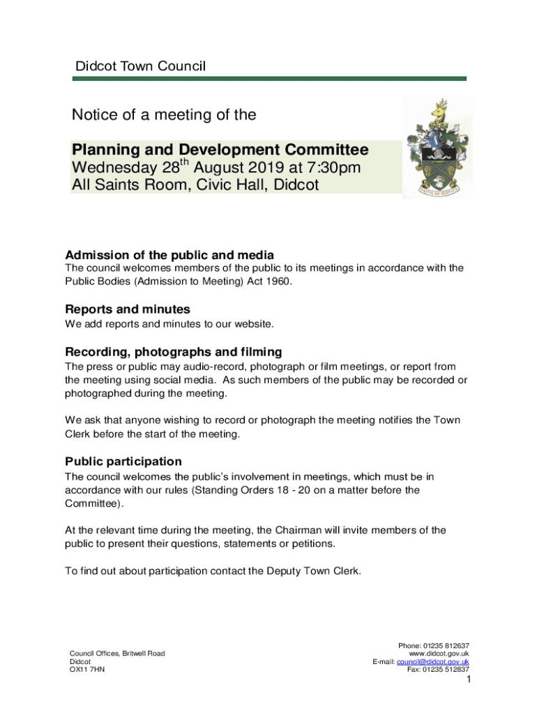 Did cot Town CouncilNotice of a meeting of the Planning and Development Committee Wednesday 28th August 2019 at 7:30pm All Saints Room, Civic Hall, DidcotAdmission of the public and media The council