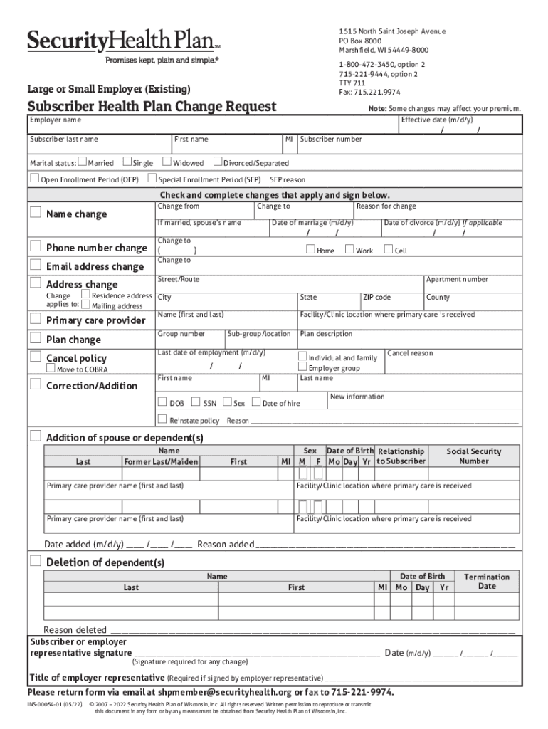 Fax: 715.221.9974Large or Small Employer (Existing)Subscriber Health Plan Change