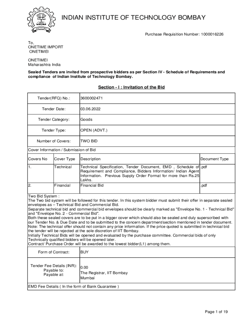 INDIAN INSTITUTE OF TECHNOLOGY BOMBAY Purchase Requisition Number: 1000016226 To, ONETIME IMPORT ONETIME Maharashtra India Sealed Tenders are invited from prospective bidders as per Section IV Schedule