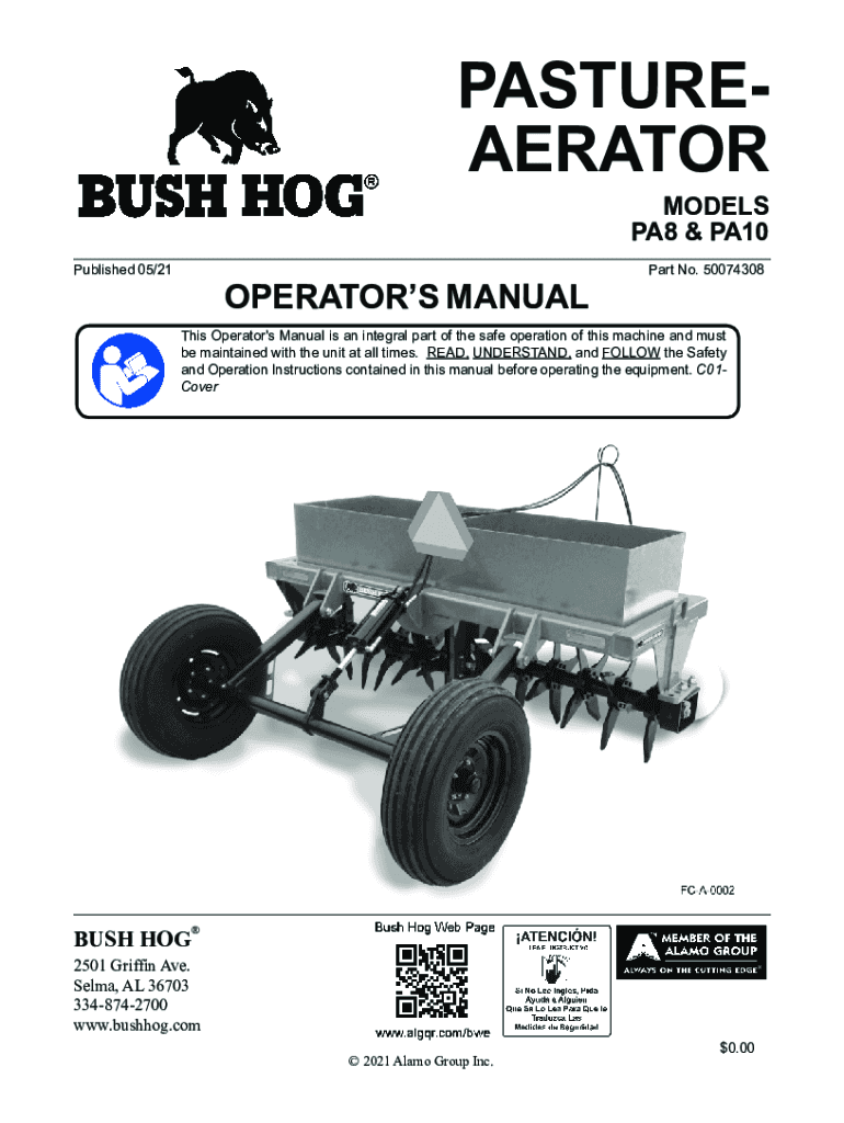 PASTUREAERATOR MODELS PA8 & PA10Published 05/21OPERATORS MANUALPart No. 50074308This Operator\'s Manual is an integral part of the safe operation of this machine and must be maintained with the unit