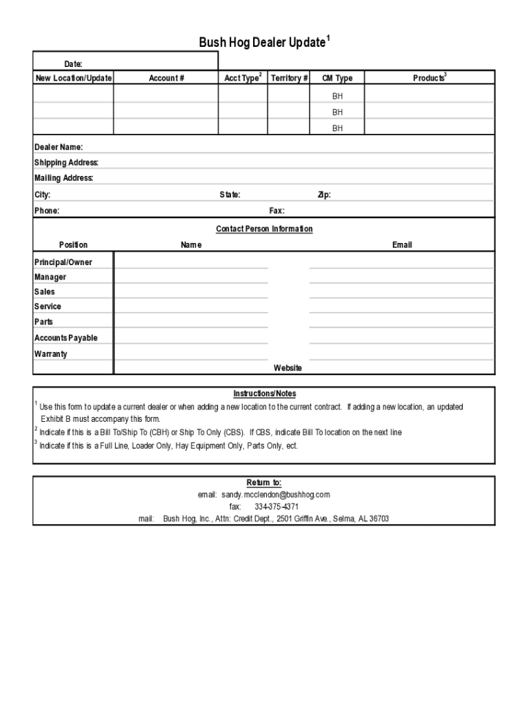 Bush Hog Dealer Update 1 Date: New Location/UpdateAccount #Acct Type 2Territory #Products3CM Type BH Dealer Name: Shipping Address: Mailing Address: City:State:Phone:Zip: Fax:Contact Person Information