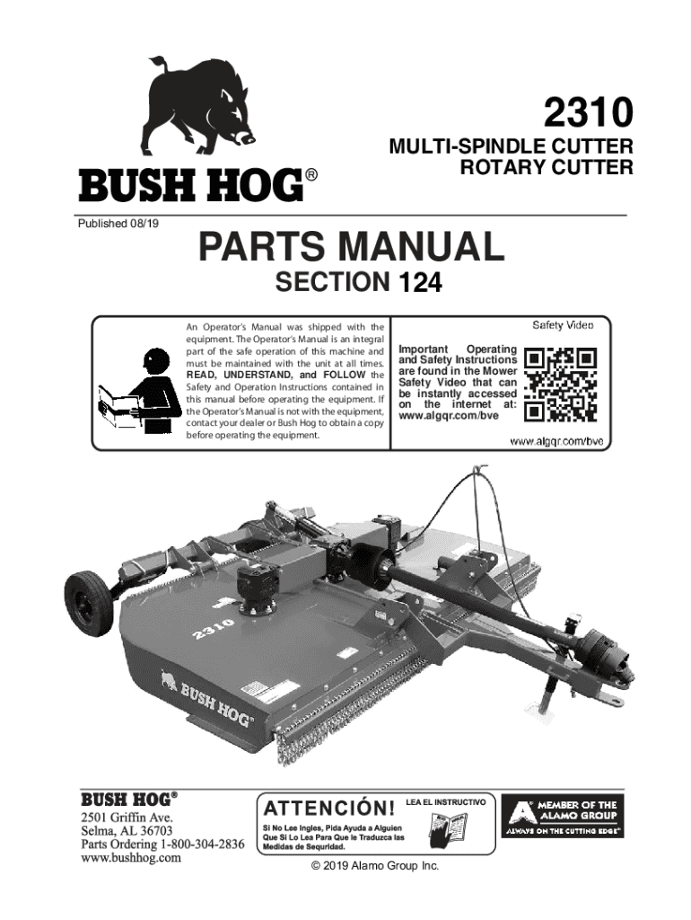 2310 MULTISPINDLE CUTTER ROTARY CUTTER Published 08/19PARTS MANUAL SECTION 124 An Operators Manual was shipped with the equipment. The Operators Manual is an integral part of the safe operation of