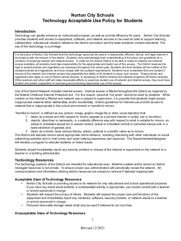Norton City Schools Technology Acceptable Use Policy for Students Introduction Technology can greatly enhance an instructional program, as well as provide efficiency for users. Norton City Schools