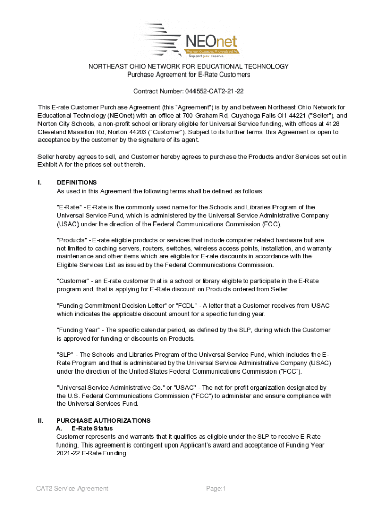 NORTHEAST OHIO NETWORK FOR EDUCATIONAL TECHNOLOGY Purchase Agreement for Rate Customers Contract Number: 044552CAT22122 This Rate Customer Purchase Agreement (this \” Agreement\”) is by and between