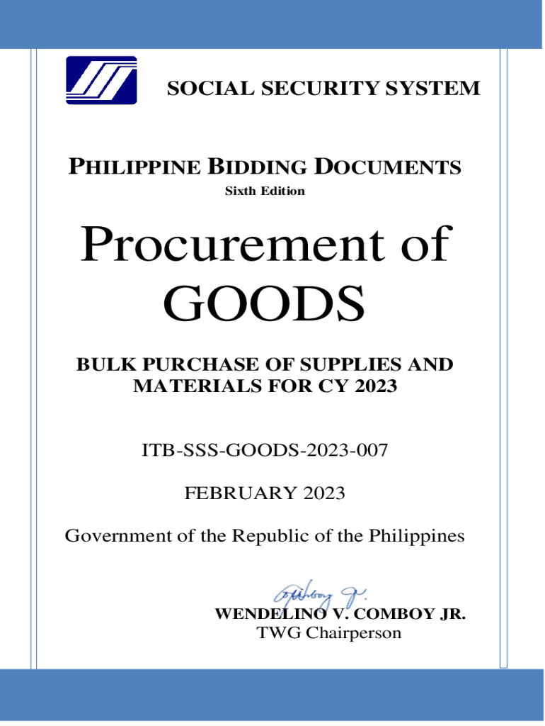 SOCIAL SECURITY SYSTEMPHILIPPINE BIDDING DOCUMENTS Sixth EditionProcurement of GOODS BULK PURCHASE OF SUPPLIES AND MATERIALS FOR CY 2023ITBSSSGOODS2023007 FEBRUARY 2023 Government of the Republic
