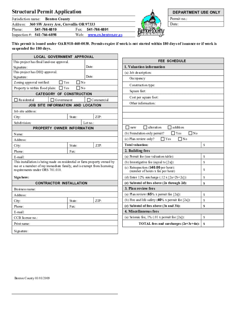 Structural Permit ApplicationDEPARTMENT USE ONLY Permit no.: Date:Jurisdiction name: Benton County Address: 360 SW Avery Ave, Corvallis OR 97333 5417666819 Phones: Fax: 5417666891 Inspection #: 5417666898