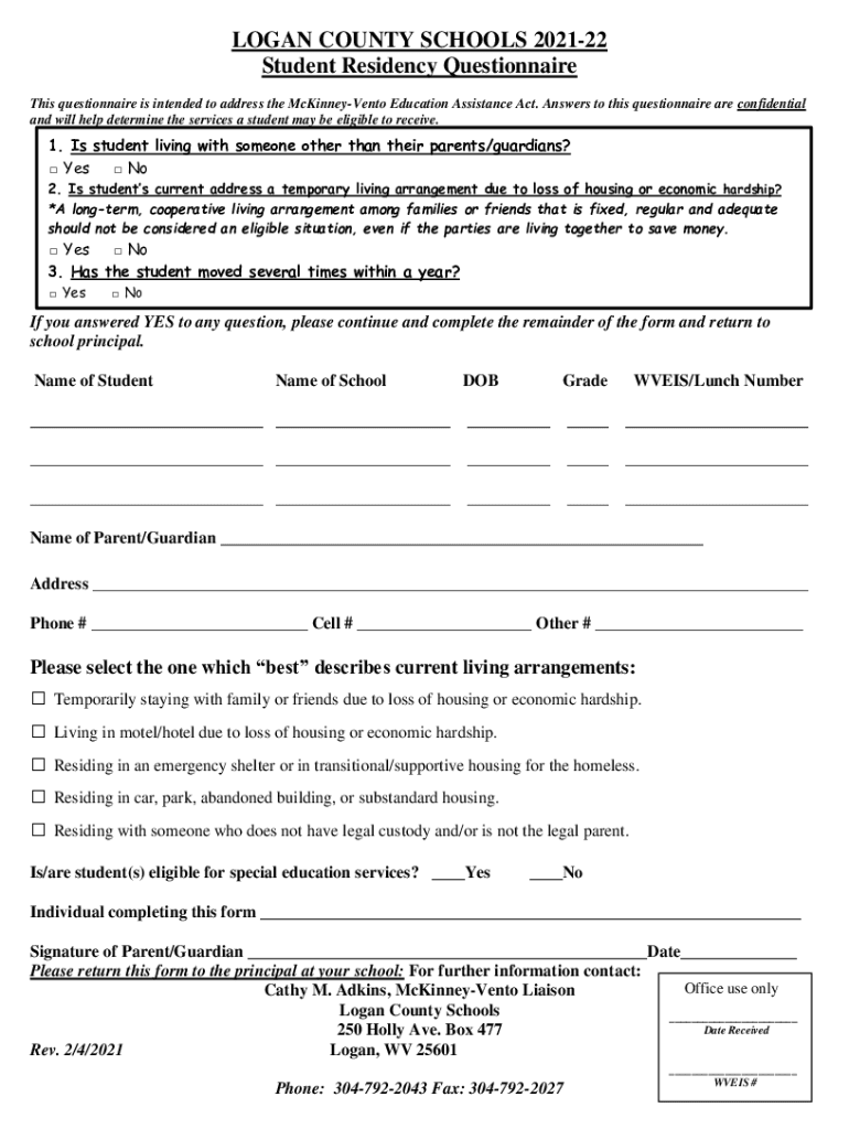 LOGAN COUNTY SCHOOLS 202122 Student Residency Questionnaire This questionnaire is intended to address the McKinneyVento Education Assistance Act. Answers to this questionnaire are confidential and