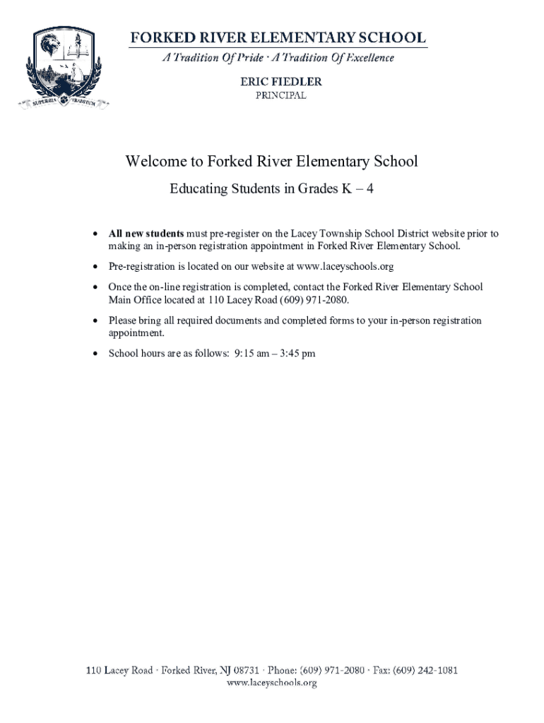 Welcome to Forked River Elementary School Educating Students in Grades K 4 All new students must preregister on the Lacey Township School District website prior to making an unperson registration