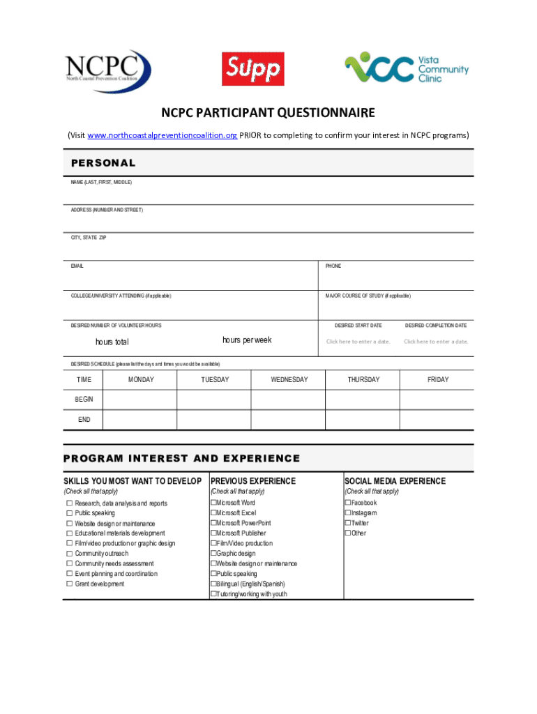 CPC PARTICIPANT QUESTIONNAIRE (Visit www.northcoastalpreventioncoalition.org PRIOR to completing to confirm your interest in CPC programs)PERSONAL NAME (LAST, FIRST, MIDDLE)ADDRESS (NUMBER AND STREET)CITY,