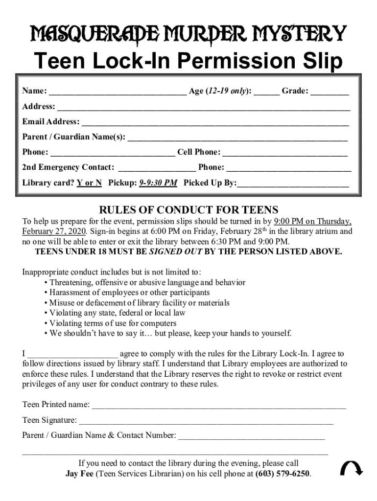MASQUERADE MURDER MYSTERY Teen Locking Permission Slip Name: ___ Age (1219 only): ___ Grade: ___ Address: ___ Email Address: ___ Parent / Guardian Name(s): ___ Phone: ___ Cell Phone: ___ 2nd Emergency