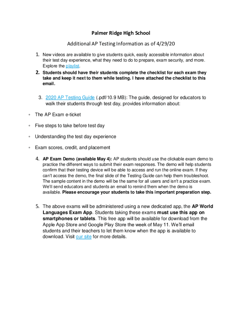 Palmer Ridge High School Additional AP Testing Information as of 4/29/20 1. New videos are available to give students quick, easily accessible information about their test day experience, what they