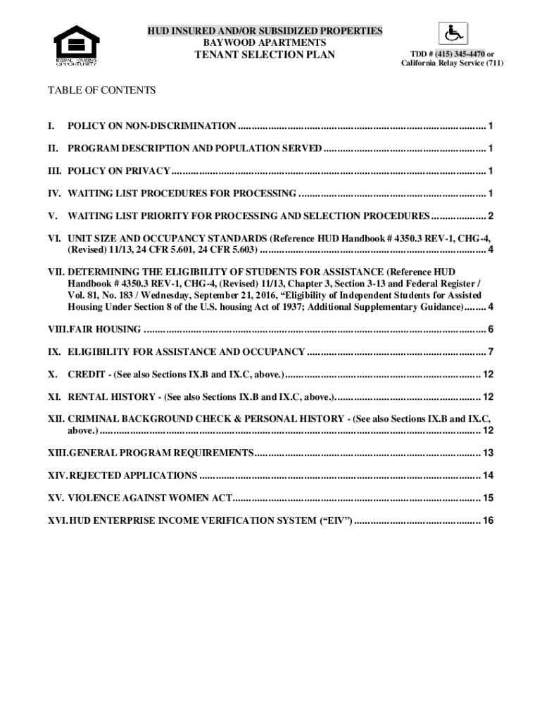 HUD INSURED AND/OR SUBSIDIZED PROPERTIES BAYWOOD APARTMENTSTENANT SELECTION PLANTED # (415) 3454470 or California Relay Service (711)TABLE OF CONTENTS I.POLICY ON NONDISCRIMINATION ..........................................................................................