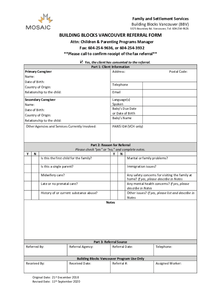 Get the free BUILDING BLOCKS REFERRAL FORM - Vancouver - MOSAIC