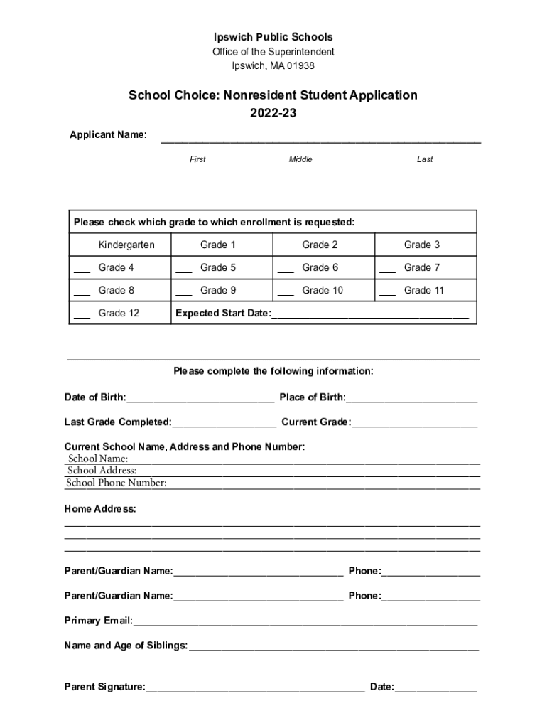 Ipswich Public Schools Office of the Superintendent Ipswich, MA 01938School Choice: Nonresident Student Application 202223 Applicant Name:___ FirstMiddleLastPlease check which grade to which enrollment