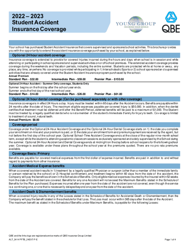 2022 2023 Student Accident Insurance Coverage Your school has purchased Student Accident Insurance that covers supervised and sponsored school activities. This brochure provides you with the opportunity
